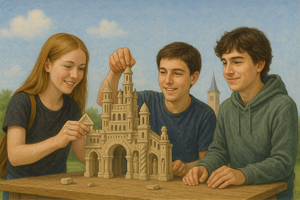 En t’inspirant du Palais du Facteur Cheval, assemble des éléments d’architecture de la ville de Château-Gontier, voûtes, colonnes, sculptures, pour créer ton palais imaginaire.