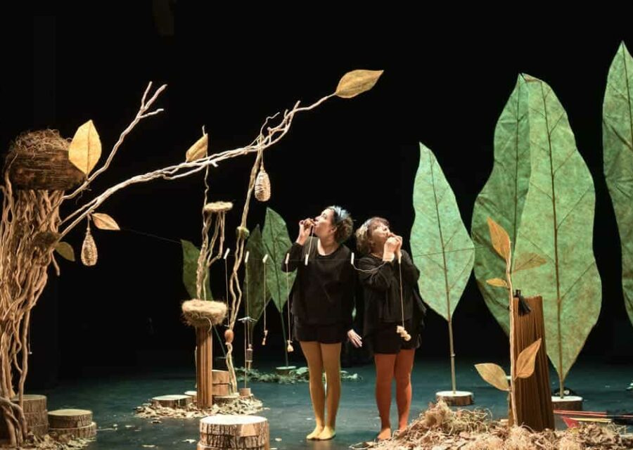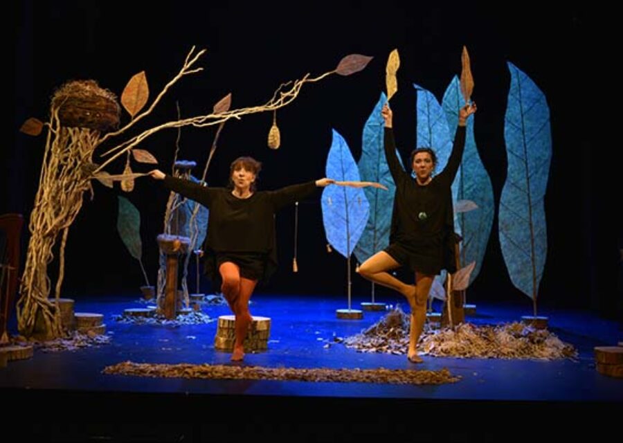 Au fil des saisons, sous le murmure des feuilles et du vent, les voix, gestes et instruments se mêlent dans un langage emprunté à celui des oiseaux. Entre musique, chant et théâtre d’objets, le spectacle nous transporte dans un voyage imaginaire et poétique. Les deux chanteuses instrumentistes se mêlent à la faune et la flore qui les entourent en créant un langage rythmique et mélodique en miroir avec celui de la nature.