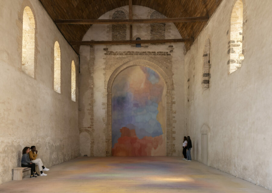 Le titre de l’exposition, Passage vers le chœur, suggère la mobilité : il contient l’idée de la traversée, avec ou sans obstacle à franchir, d’une chapelle du XIIe siècle assez austère, qui cache à l’arrière de son chœur de beaux fragments de peintures murales romanes. C’est à un voyage vers la peinture enfouie que l’artiste nous convie, un voyage dans le temps, donc, qui charrie mémoire autant qu’oubli.