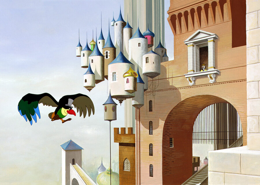 Seul un oiseau, enjoué et bavard, qui a construit son nid en haut du gigantesque palais, tout près des appartements secrets de Sa Majesté, ose le narguer. Le Roi est amoureux d’une charmante et modeste bergère qu’il veut épouser sous la contrainte. Mais celle-ci aime un petit ramoneur. Tous deux s’enfuient pour échapper au Roi…