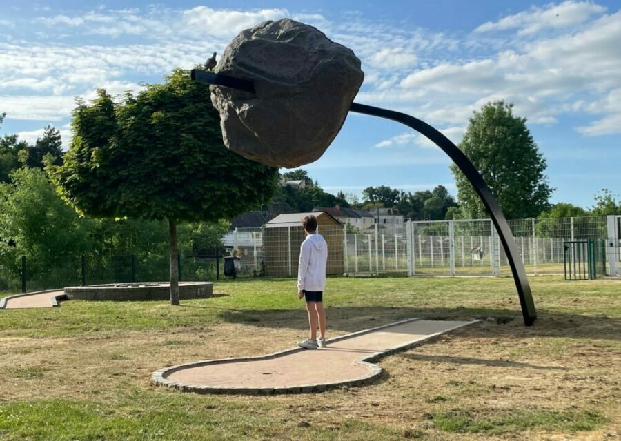 Traversé par un tube d’acier, tel un cure-dent dans une olive, un rocher surplombe dangereusement le spot de minigolf. La rupture est-elle proche ?
