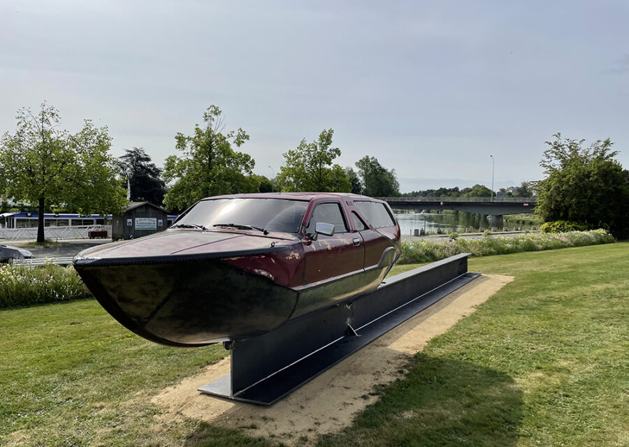 L’artiste combine dans cette œuvre deux formes emblématiques du XXème siècle : la voiture et le bateau de plaisance. A partir de ce recyclage de matière, il crée un objet rétro-futuriste qui questionne la société de consommation et de loisirs. Cette œuvre a été réalisée au cours d’une résidence menée cette année sur le territoire, en lien avec les élèves du Lycée Professionnel Pierre et Marie Curie de Château-Gontier sur Mayenne.