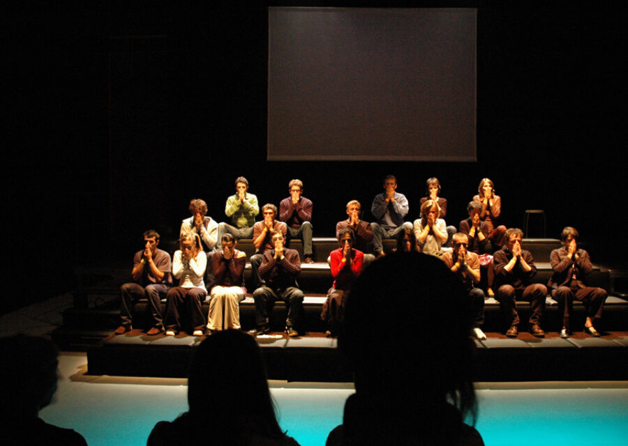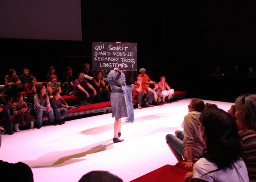 Guidés par des partitions vidéo-projetées, de mots à dire ou de gestes à faire, les spectateurs répartis de part et d’autre de la scène se retrouvent peu à peu pris dans une joute saugrenue et débridée. Scandant des sons au groupe d’en face, les voix fusent, ripostent et fustigent quand les gestes flattent, grondent ou interrogent. Oubliez le silence de mise dans les théâtres, vous avez des choses à dire et vos voisins aussi ! Ce joyeux moment collectif partagé pourrait bien aussi vous donner envie de raser les haies de thuyas de votre quartier…