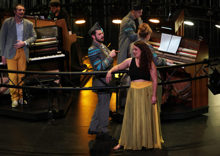 Pour cette audacieuse adaptation, Sandrine Anglade réunit une troupe généreuse et complémentaire dans une scénographie mobile et dynamique dont quatre pianos constituent le point fort. Elle resserre le drame autour des personnages principaux pour mieux mettre en lumière les sujets brûlants que la pièce aborde. Bizet parlait, en effet, bien avant tout le monde du corps des femmes et de leur désir.