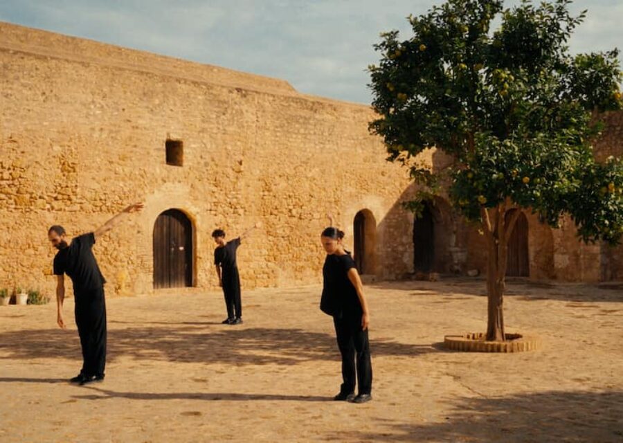 Trois danseurs habillés en noir et un arbre dans une cour entourée de hauts murs de couleur ocre.