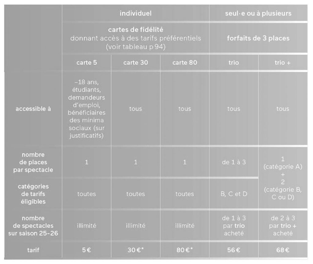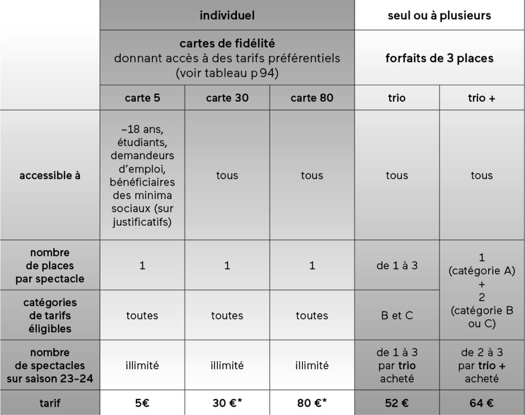 Tarif exceptionnel : plein tarif › 45 € / tarif réduit & cartes fidélité 30 et 80 › 35 € / carte fidélité 5* › 30 €