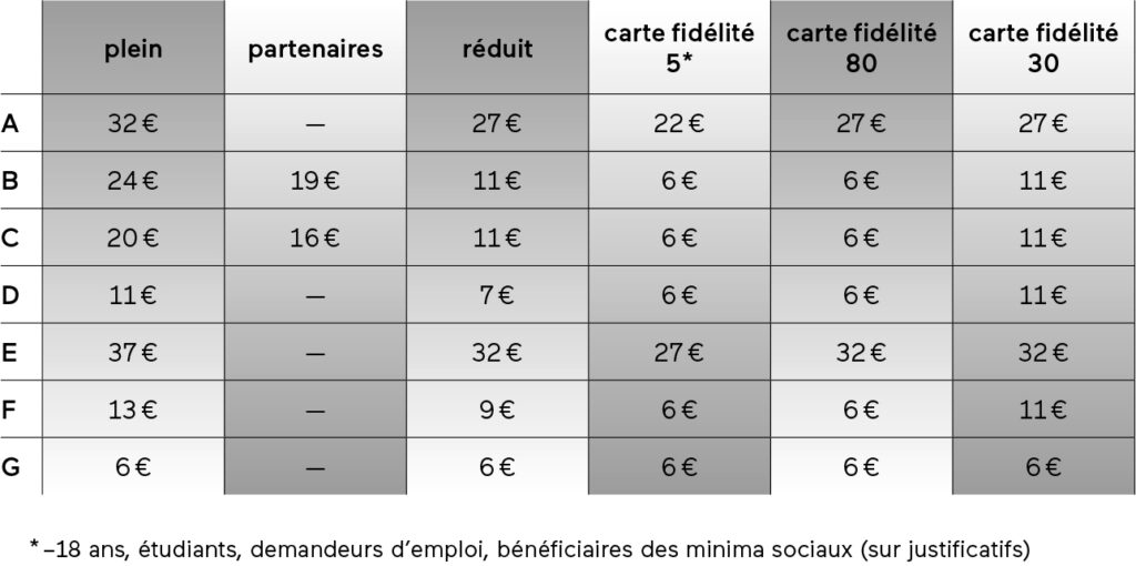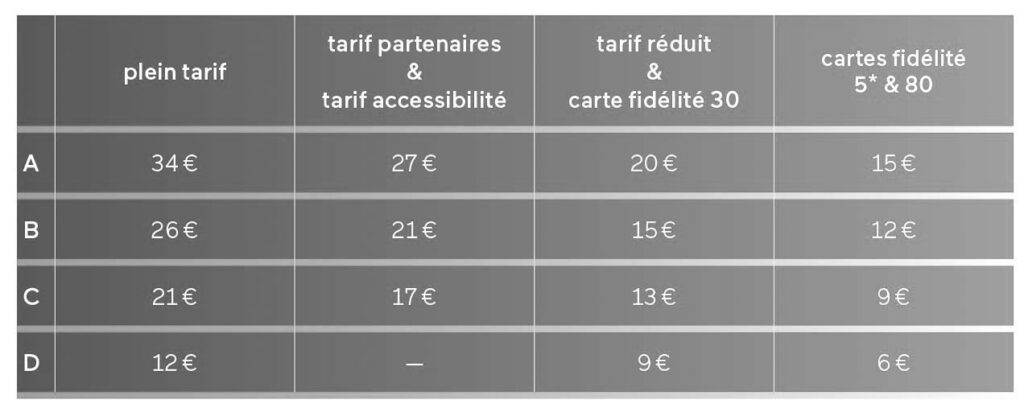 Le tarif de chaque spectacle est indiqué d’une lettre allant de A à D sur sa page de présentation.